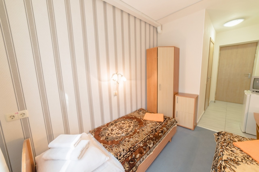 - 2-местный стандарт малый. (1 номер) Площадь 10 кв.м. В номере: две односпальные кровати, телевизор, холодильник, кондиционер, санузел с душем. Дополнительное место не устанавливается.