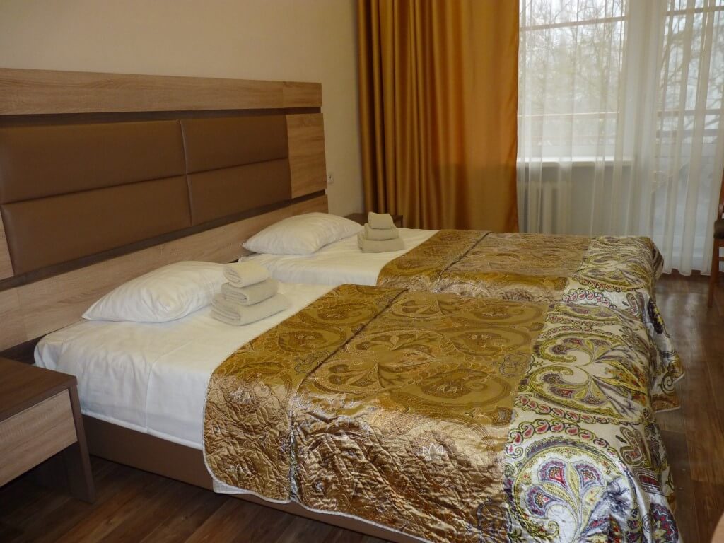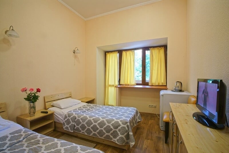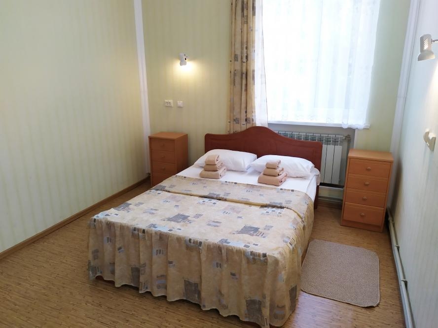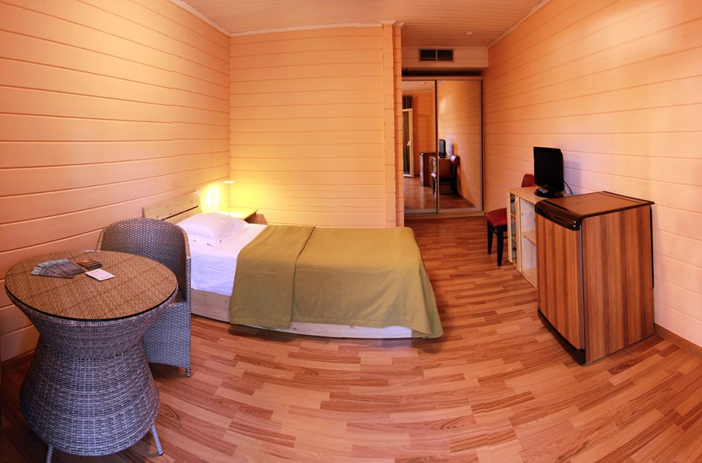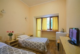 - 2-местный 1-комнатный 1 категория. Площадь: 17 кв.м. В номере: две односпальные кровати с ортопедическими матрасами, холодильник, телефизор, мини-холодильник, санузел с душем в пол. Вид из номера на парк.