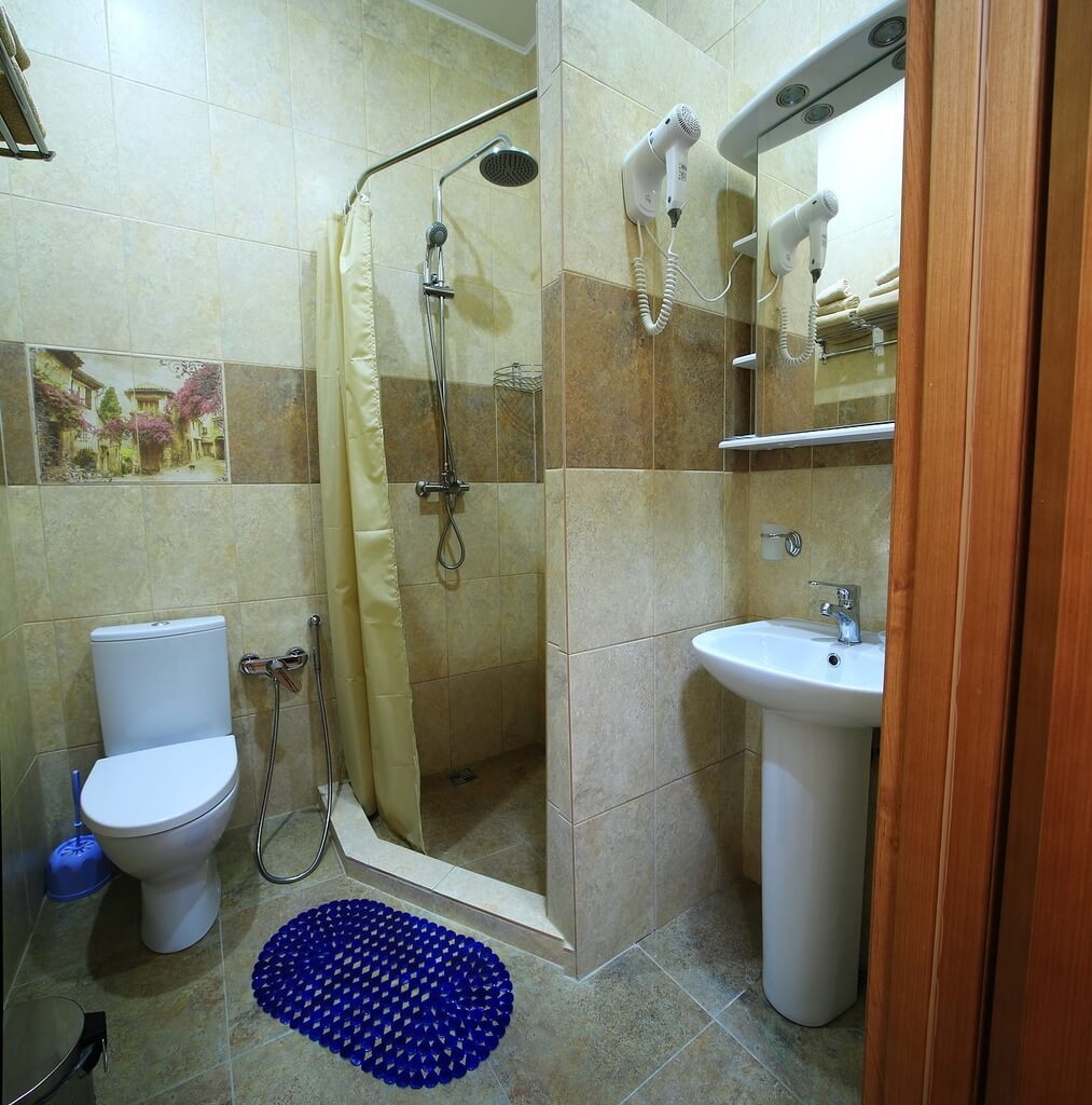 - 2-местный 1-комнатный Стандарт-комфорт плюс. Площадь 14 кв.м. В номере: две раздельные кровати с ортопедическими матрасами, LCD панель, холодильник, электрочайник, сплит-система, ванная комната с душевой кабиной, фен, набор мини-парфюмерии, сейф, балкон.