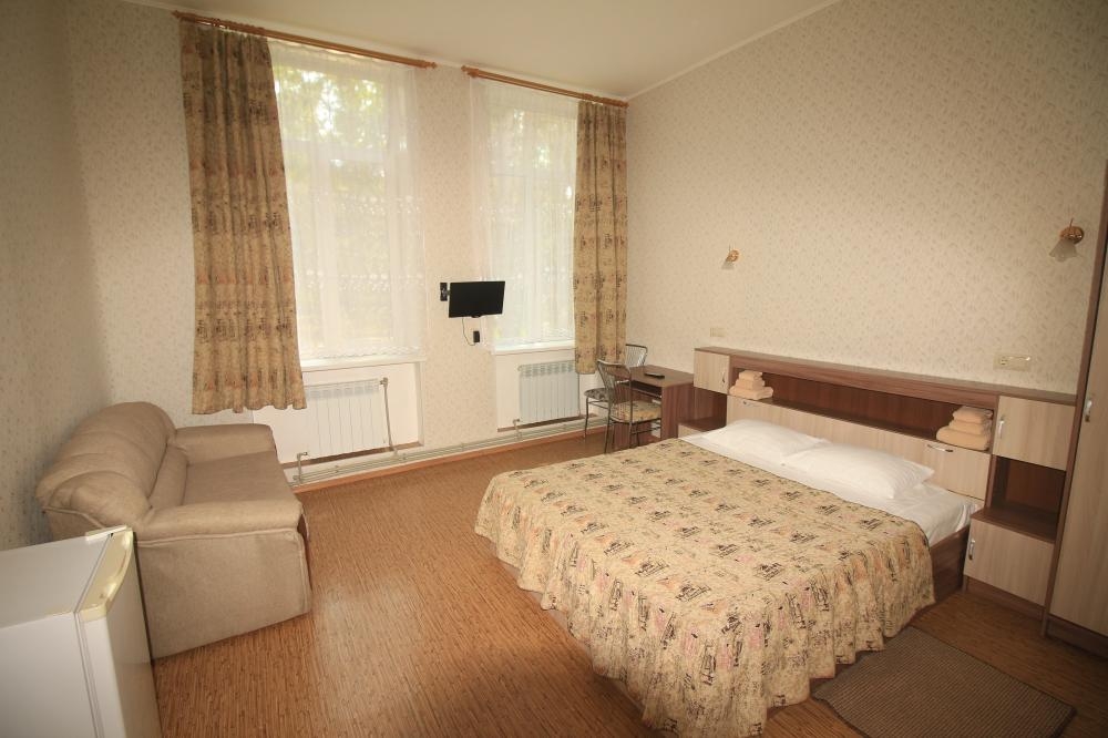 - 2-местный 1-комнатный Эконом-семейный. Площадь: 19 кв.м. В номере: одна двуспальная кровать с ортопедическим матрасом, диван, холодильник, телефизор, мини-холодильник, санузел с душем в пол. Вид из номера на парк.