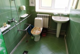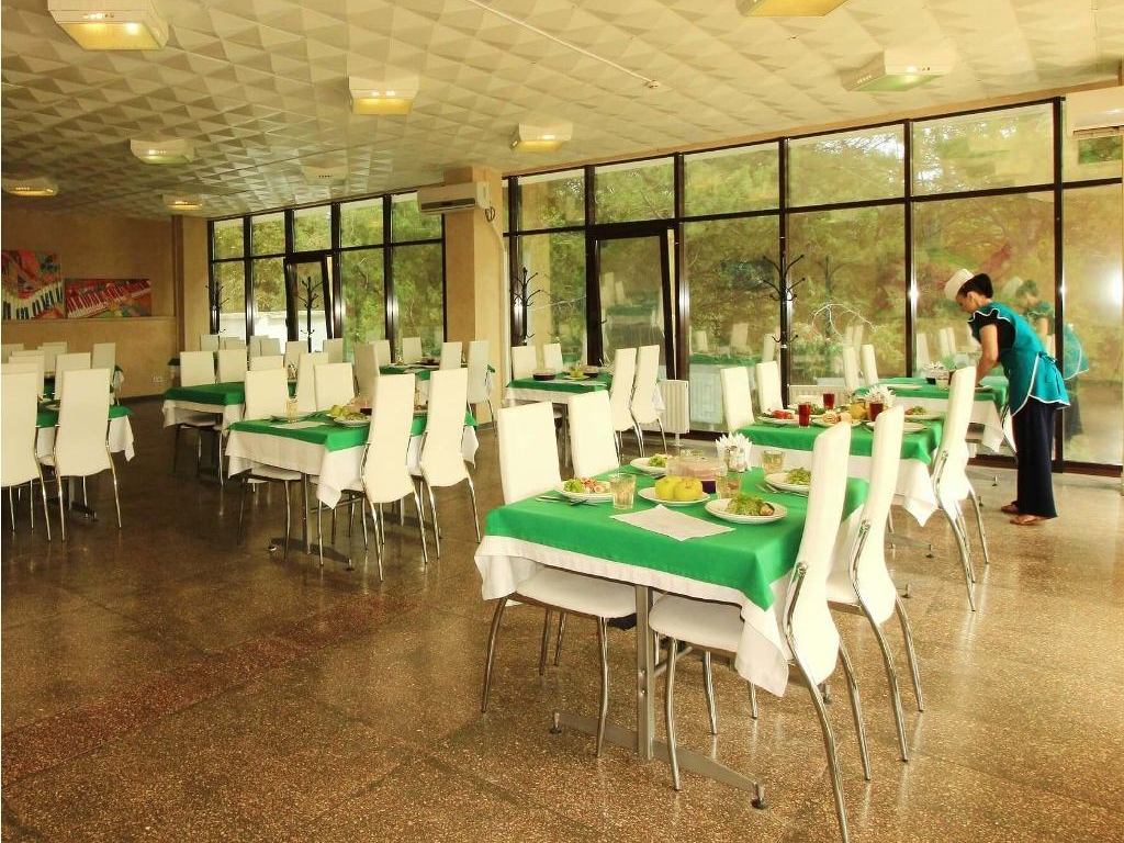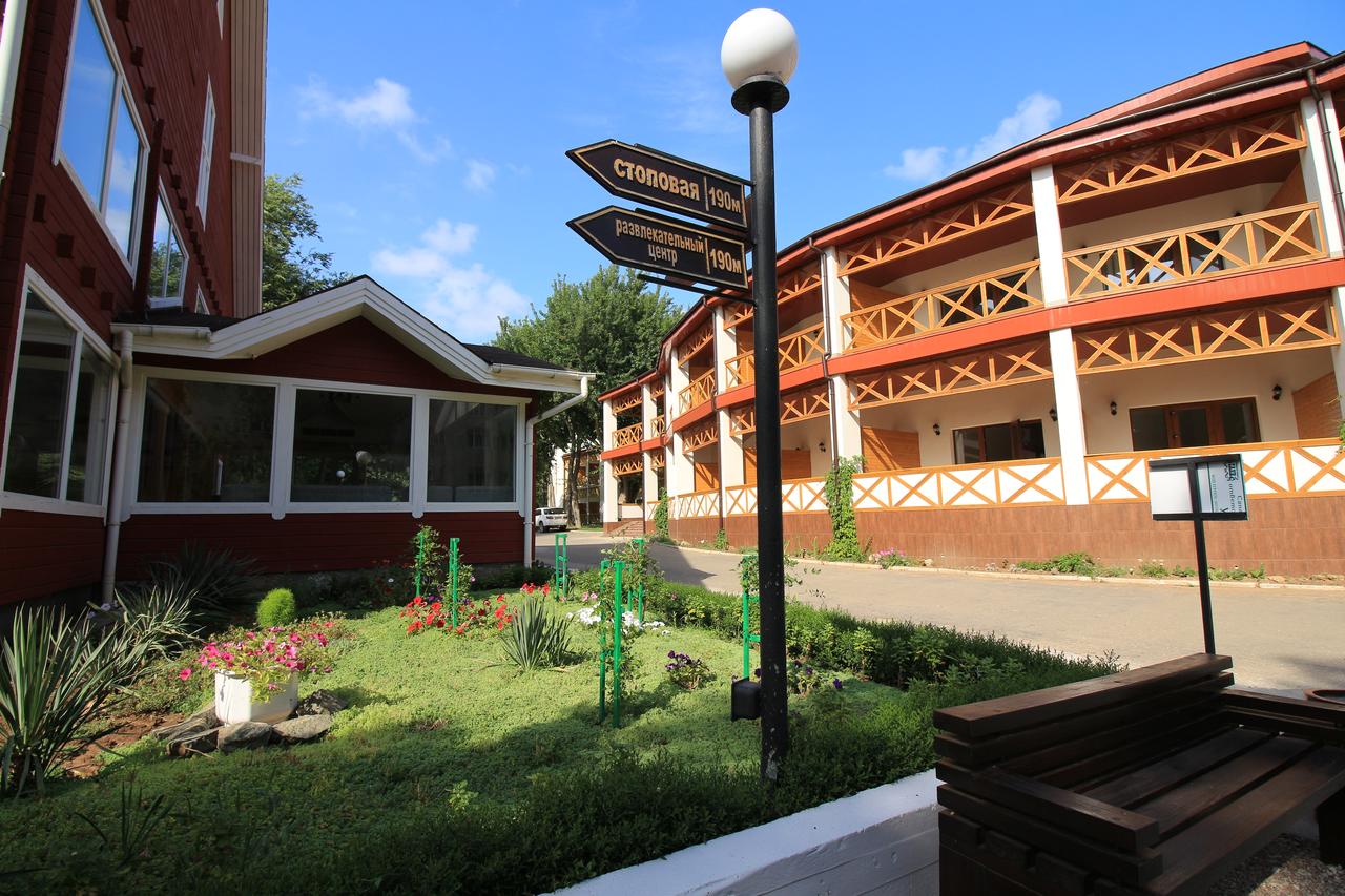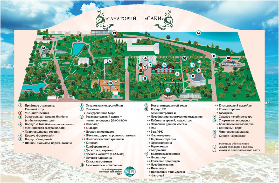 Размещение: четыре жилых корпуса, столовая, администрация, водогрязелечебница, все корпуса отдельно стоящие, без переходов. Предоставляется электромобиль до грязелечебницы.