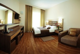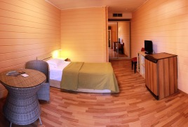 - 2-местный 1-комнатный Люкс-супериор. Площадь: 18 кв.м. В номере: двуспальная кровать с ортопедическим матрасом, LCD панель, ванная комната с душевой кабиной, фен, сплит-система, кондиционер, сейф