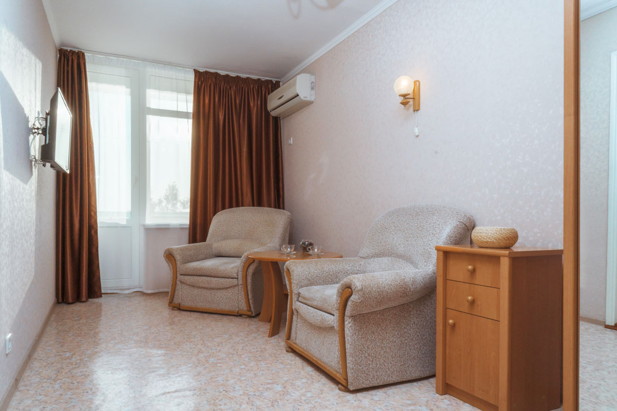 - 2-местный 2-комнатный улучшенный. Площадь: 32 кв.м. В номере: спальня с двуспальной кроватью, гостиная с мягкой мебелью, чайник, набор посуды, телевизор, холодильник, кондиционер, санузел с душевой кабиной, фен, балкон с видом на море. Дополнительное место - кресло кровать