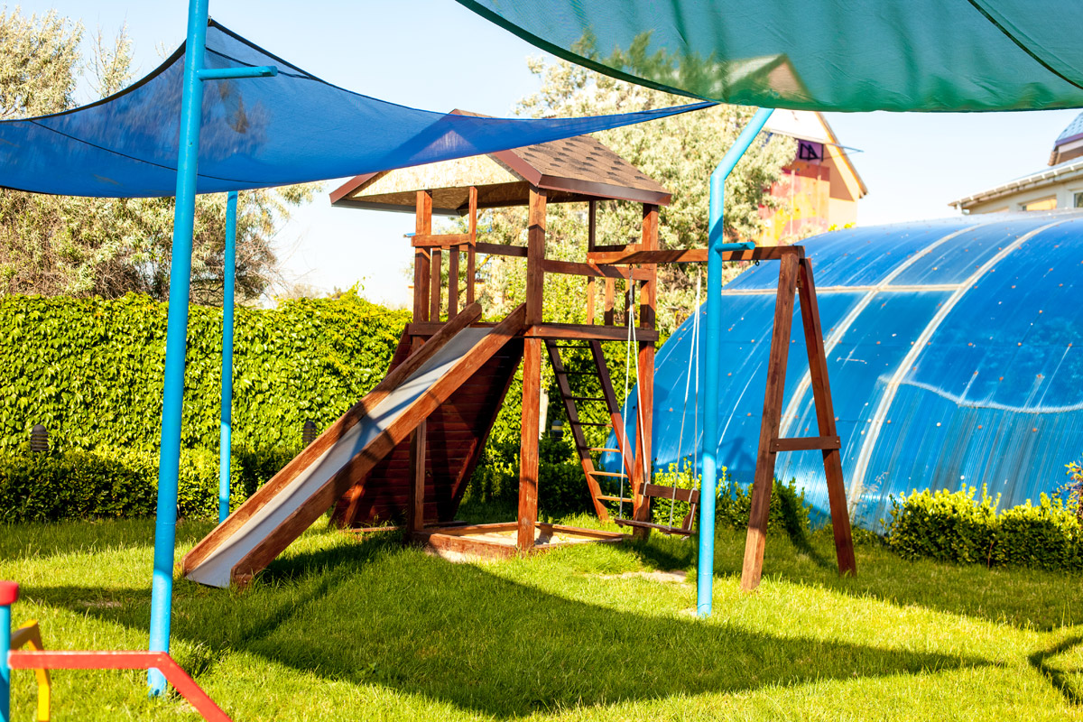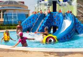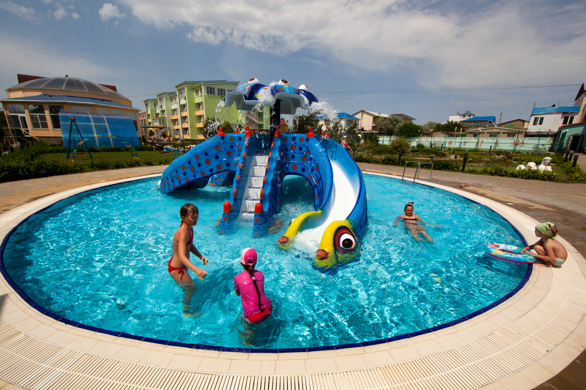 - детская летняя площадка с открытым детским бассейном и весёлой горкой в виде осьминога,