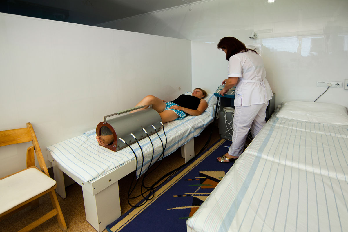 - Физиотерапия: гальванизация, электрофорез с медикаментами, ингаляции, лазеротерапия, магнитолазерная терапия, диадинамотерапия (ДДТ), СМТ-терапия, ультразвуковая терапия, дарсонвализация, магнитотерапия, сухие углекислые ванны, андрогин, прессотерапия