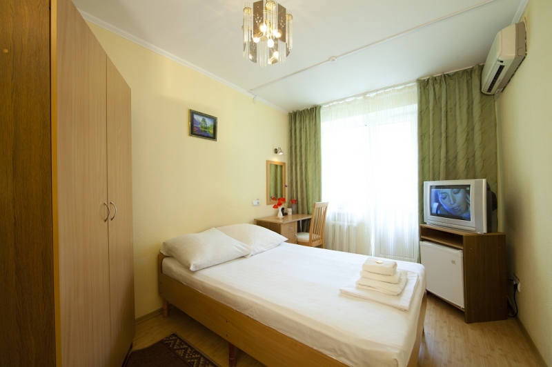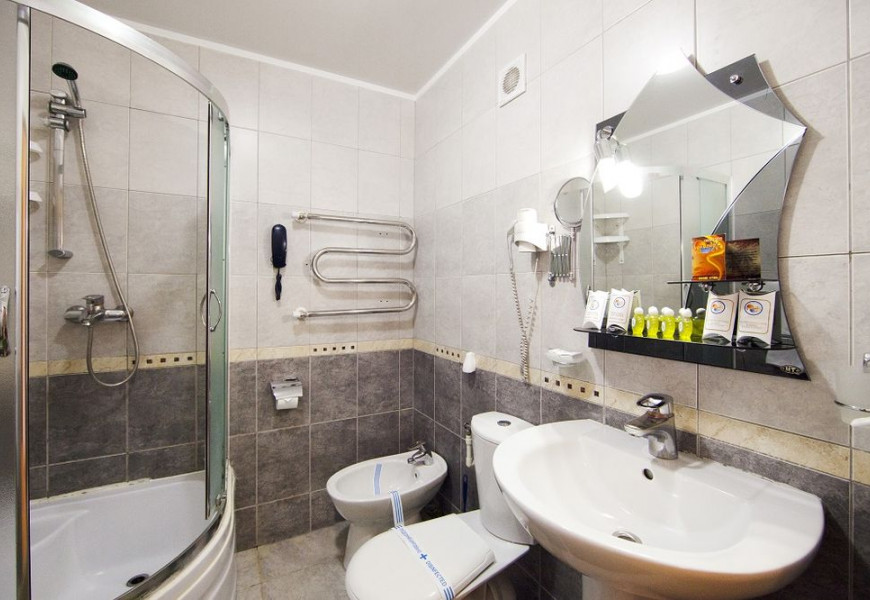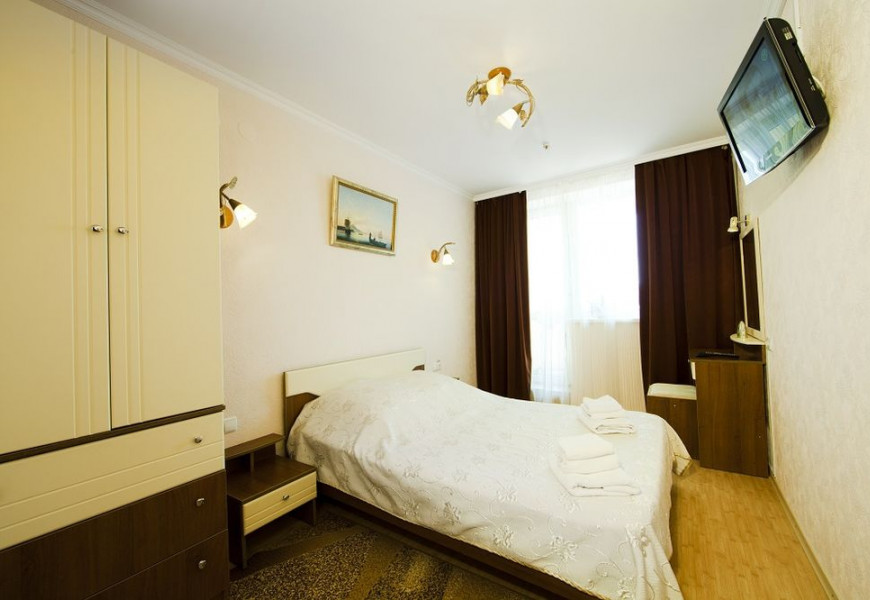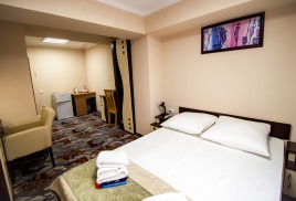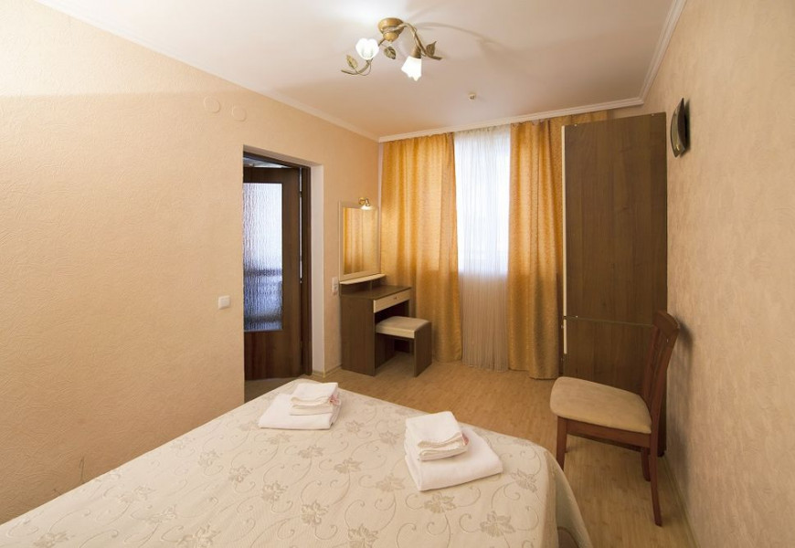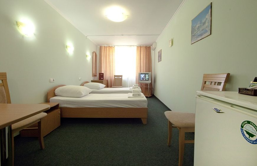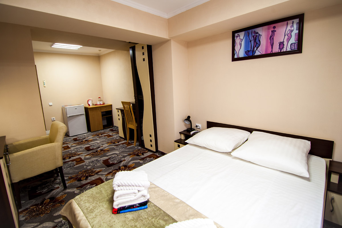 - 2 местный 1-комнатный Улучшенный номер. Площадь 16 кв.м. В номере: двуспальная кровать шириной 1, 4 м., набор мебели, кондиционер, холодильник, телевизор, сейф, телефон, чайник, wi-fi, санузел (душ, туалет, умывальник, фен, халат, набор полотенец, тапочки, мини-парфюмерия), балкон. Дополнительное место не предусмотрено.