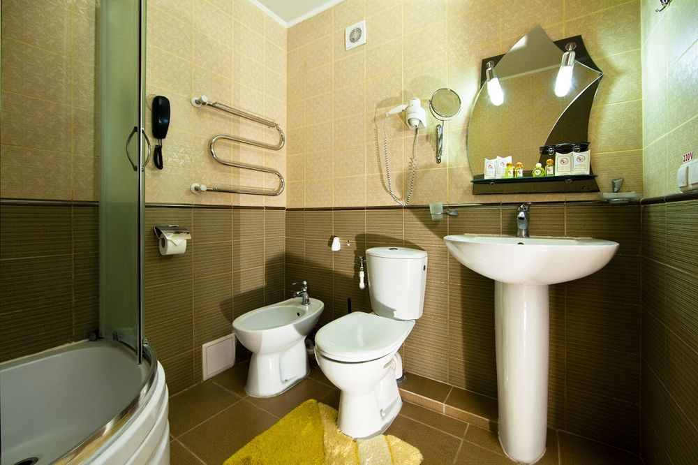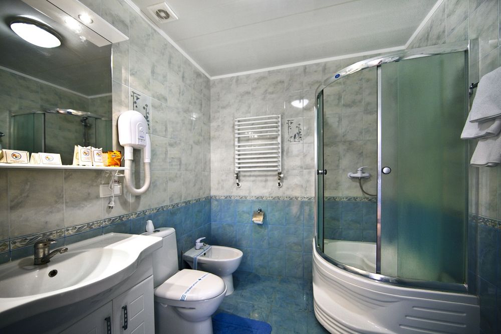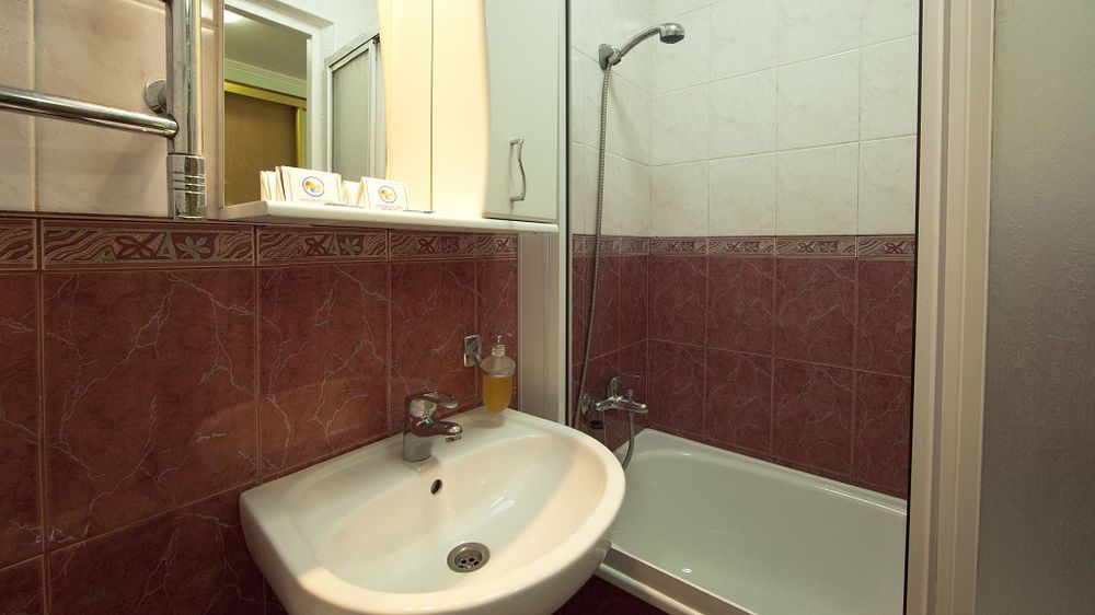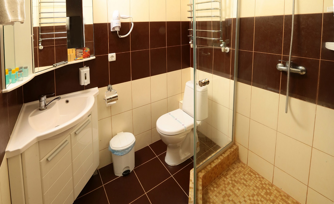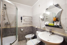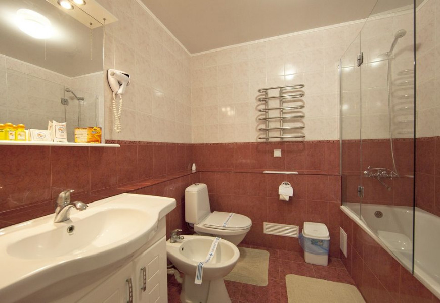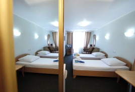 - 2 местный 1-комнатный Улучшенный номер. Площадь 16 кв.м. В номере: двуспальная кровать шириной 1, 4 м., набор мебели, кондиционер, холодильник, телевизор, сейф, телефон, чайник, wi-fi, санузел (душ, туалет, умывальник, фен, халат, набор полотенец, тапочки, мини-парфюмерия), балкон. Дополнительное место не предусмотрено.