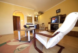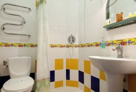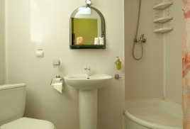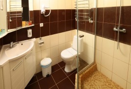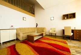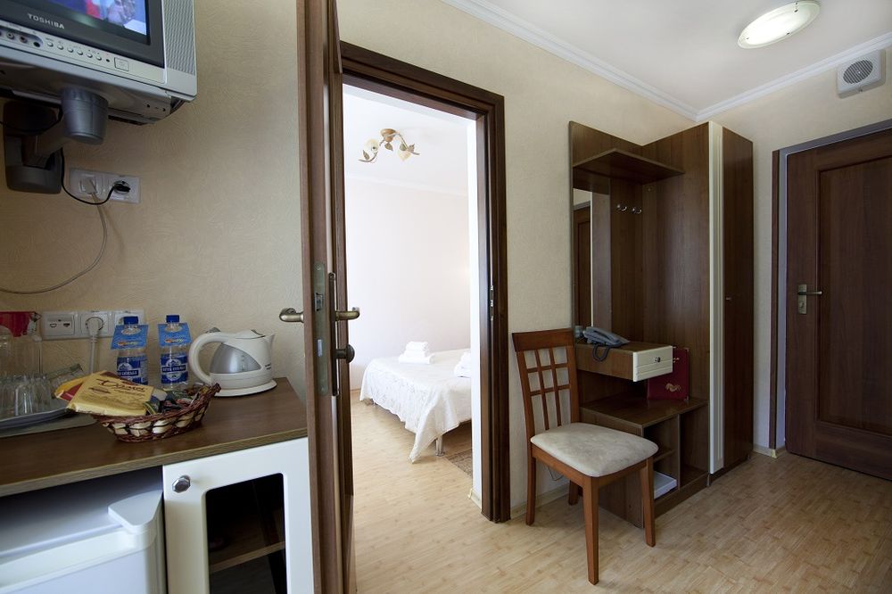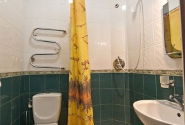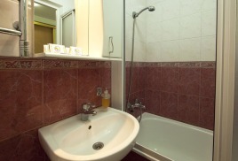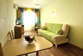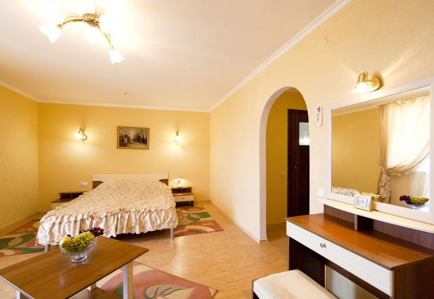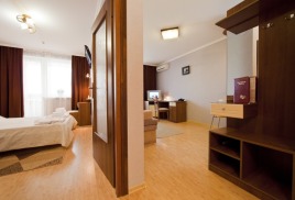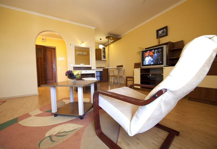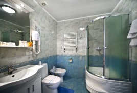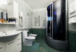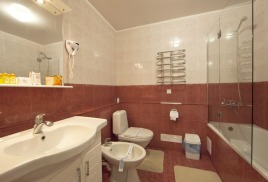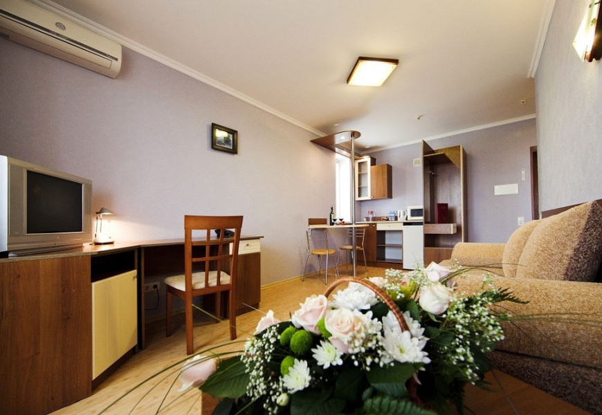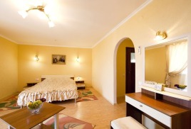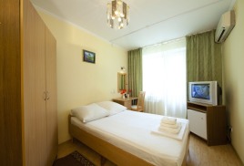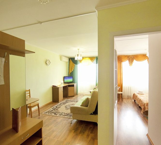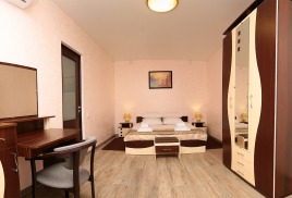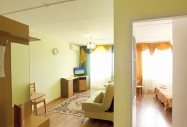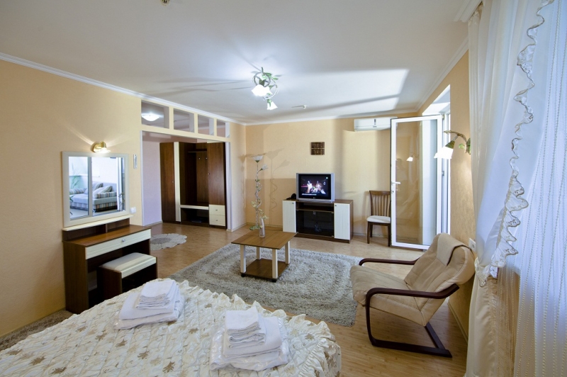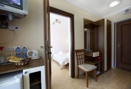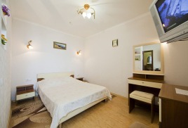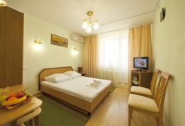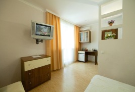 - 2 местный 1-комнатный Комфортабельный Плюс. Площадь 32 кв.м., расположен на 4 этаже. В номере прихожая и одна большая комната: одна двуспальная кровать шириной 1, 6 м, кресло-кровать, набор мебели, миникухня, микроволновая печь, кондиционер, холодильник, телевизор, сейф, телефон, чайник, wi-fi, санузел (душ, туалет, умывальник, фен, халат, набор полотенец, тапочки, мини-парфюмерия), балкон. Предусмотрено одно дополнительное место.