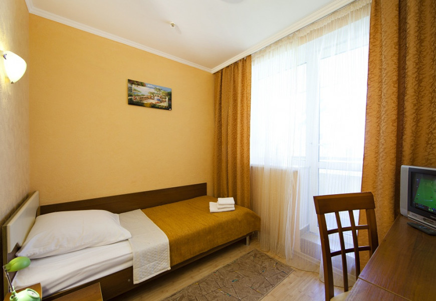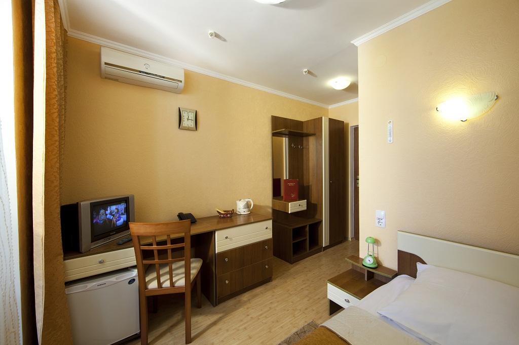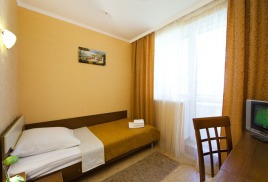 - 1 местный 1-комнатный Стандарт Плюс. Площадь 12 кв.м. В номере: односпальная кровать, набор мебели, кондиционер, холодильник, телевизор, сейф, телефон, чайник, wi-fi, санузел (душ, туалет, умывальник, фен, халат, набор полотенец, тапочки, мини-парфюмерия), балкон. Предусмотрено одно дополнительное место.