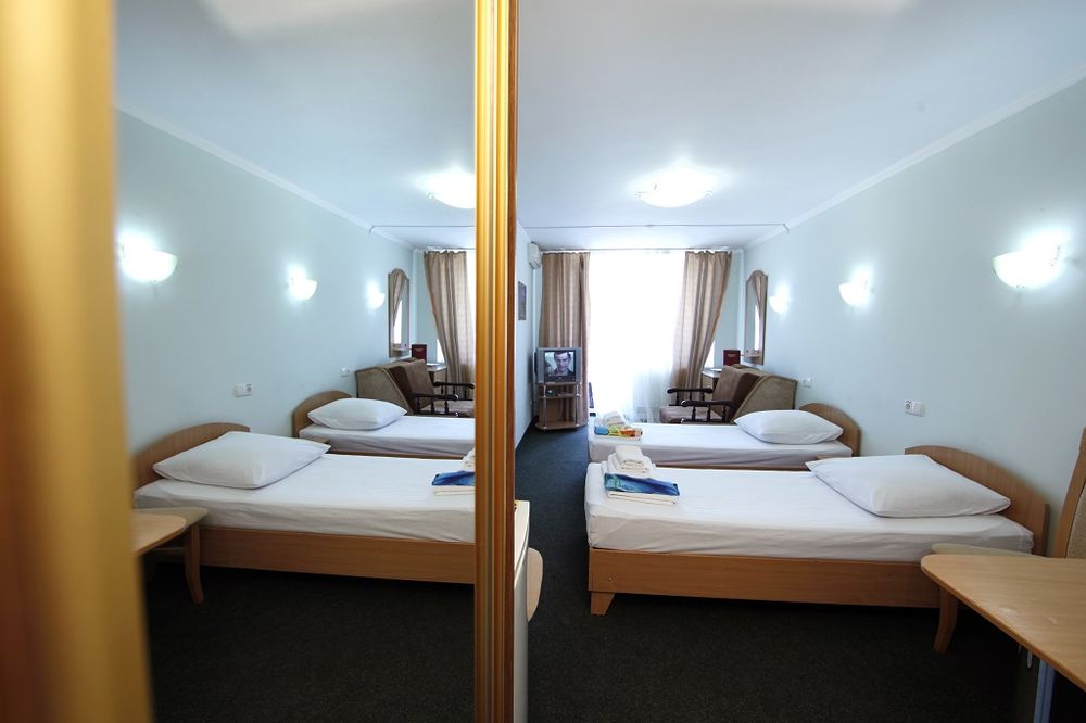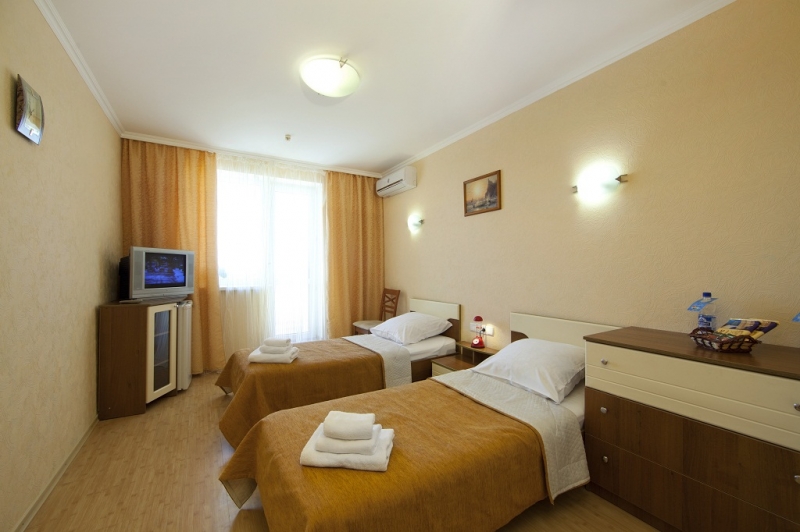 - 2 местный 1-комнатный Стандарт. Площадь 16 кв.м. В номере: две односпальные кровати шириной 0, 9м, набор мебели, кондиционер, холодильник, телевизор, сейф, телефон, чайник, wi-fi, санузел (душ, туалет, умывальник, фен, халат, набор полотенец, тапочки, мини-парфюмерия), балкон.Дополнительное место не предусмотрено.