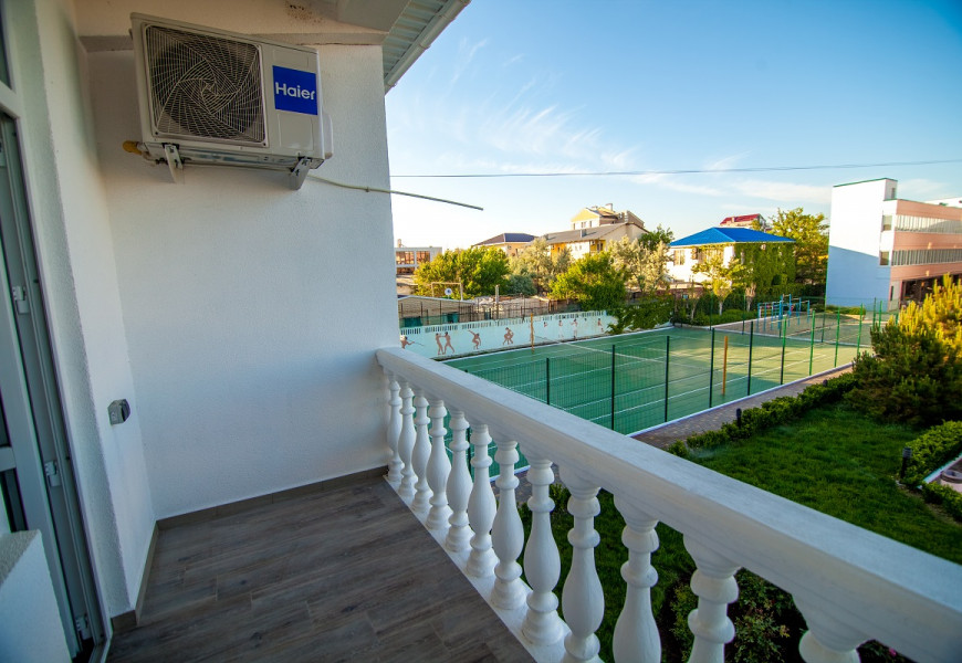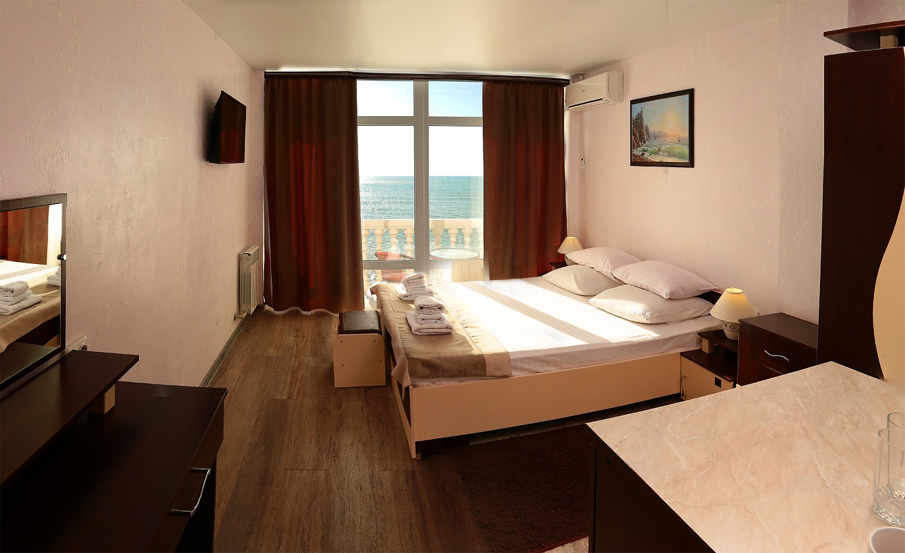 - 2 местный 1-комнатный Летний без балкона с видом на море. Площадь 15 кв.м., находятся на 3 этаже, подъем по винтовой лестнице В номере: двуспальная кровать шириной 1, 4м, набор мебели в стиле кантри, кондиционер, холодильник, телевизор, сейф, телефон, чайник, wi-fi, санузел (ванная, туалет, умывальник, фен, халат, набор полотенец, тапочки, мини-парфюмерия), балкон отсутствует. Дополнительное место не предусмотрено.