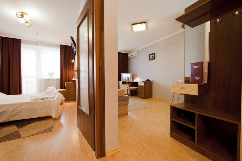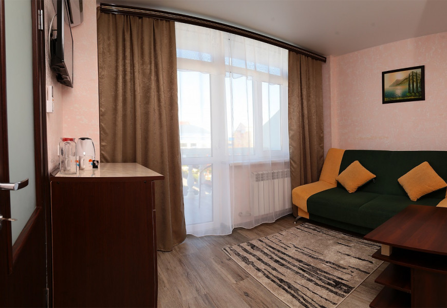 - 2 местный 2-комнатный Студия плюс Площадь 21 кв.м. В номере проходная комната и спальня: одна двуспальная кровать шириной 1, 4 м, раскладной диван, набор мебели, два бельевых шкафа, кондиционер, холодильник, телевизор, сейф, телефон, чайник, wi-fi, санузел (душ, туалет, умывальник, фен, халат, набор полотенец, тапочки, мини-парфюмерия, напольные весы), балкон. Предусмотрено одно дополнительное место.