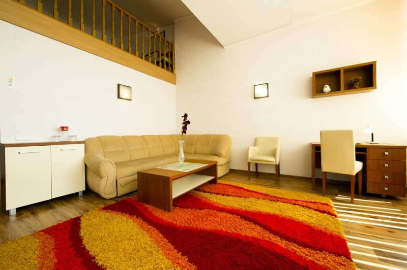 - 2 местный 2-комнатный Комфорт Плюс. Площадь 30 кв.м. В номере гостиная и спальня: двуспальная кровать шириной 1, 6м, набор мебели, раскладной двуспальный диван в гостиной, шкаф, кондиционер, холодильник, телевизор, сейф, телефон, чайник, wi-fi, санузел (душ, туалет, умывальник, фен, халат, набор полотенец, тапочки, мини-парфюмерия), балкон. Предусмотрено два дополнительных места.