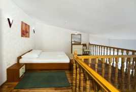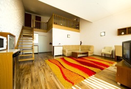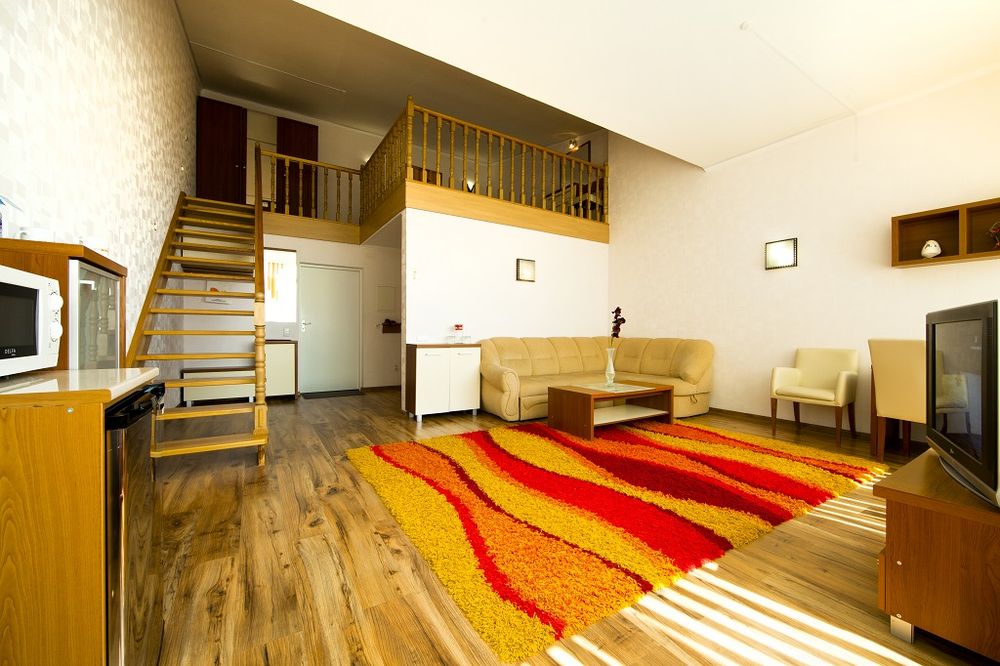 - 2 местный 2-уровневый Дуплекс Плюс. Площадь 41 кв.м. В номере: спальня на втором этаже: двуспальная кровать шириной 1, 6 м.; в гостиной: большой раскладной диван и зона отдыха, набор мебели, письменный стол, косметический столик, кухонный стол, кондиционер, холодильник, микроволновка, телевизор, сейф, телефон, чайник, wi-fi, санузел (душ, туалет, биде, умывальник, фен, халат, набор полотенец, тапочки, мини-парфюмерия), балкон с боковым видом на море и панорамным видом на окрестности.