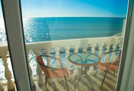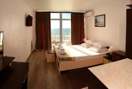 - 2 местная 1-комнатная Студия. Площадь 32 кв.м., расположение на 4 этаже. В номере: двуспальная кровать шириной 1, 4 м., набор мебели, письменный стол, косметический столик, кондиционер, холодильник, телевизор, сейф, телефон, чайник, wi-fi, санузел (душ, ванна, туалет, биде, умывальник, фен, халат, набор полотенец, тапочки, мини-парфюмерия, напольные весы), балкон с боковым видом на море. Дополнительное место не предусмотрено.