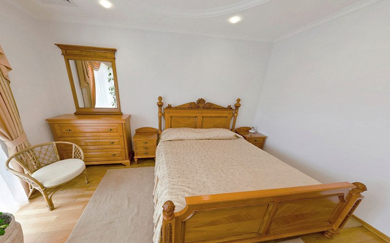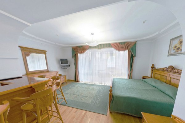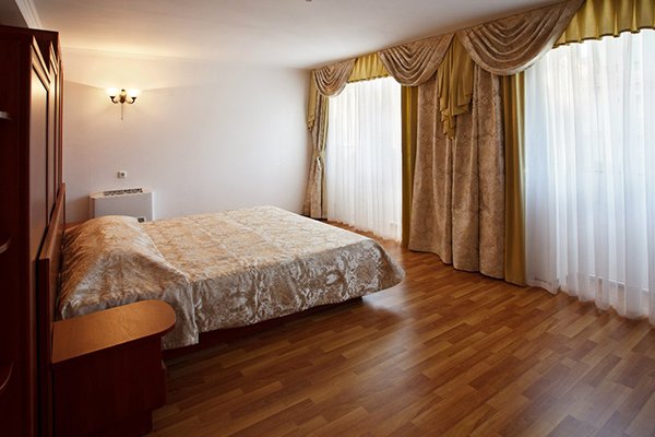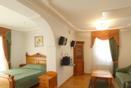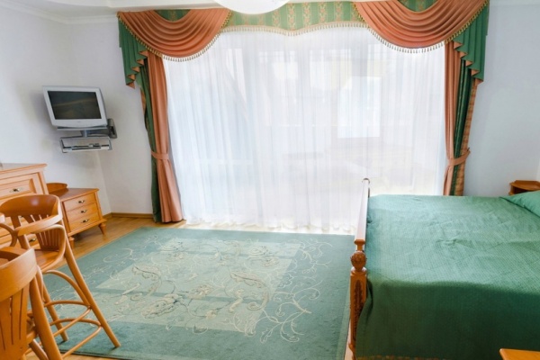- 2-местный 2-комнатный Повышенной Комфортности. Площадь: 45 кв.м В номере: спальня с двуспальной кроватью, гостинная с мягкой мебелью, кабинет, телевизор, холодильник, телефон, санузел с душевой кабиной. Вид на парковую зону и Генуэзскую крепость. Номер без балкона.