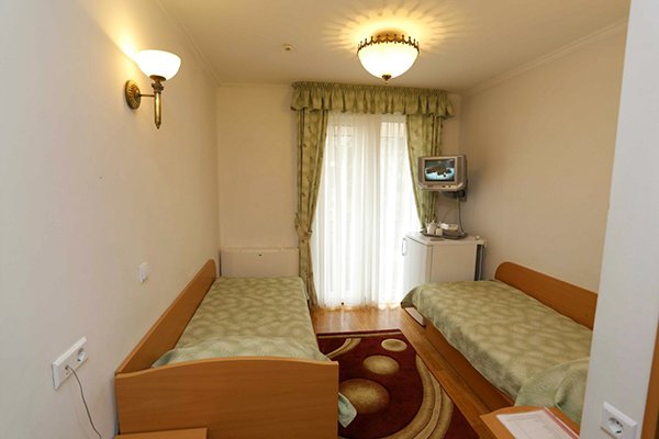 - 2-местный 1-комнатный Стандарт. Площадь: 13 кв.м. В номере: две односпальные кровати, холодильник, телевизор, санузлом с душевой кабиной, французский балкончик с видом на парковую зону и Генуэзскую крепость. Дополнительное место не предусмотрено.