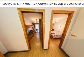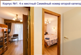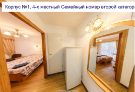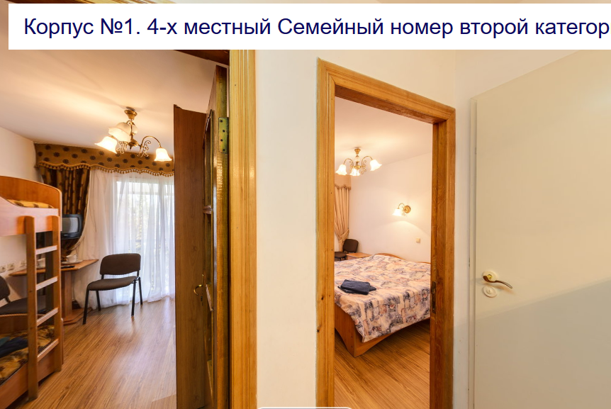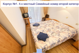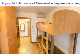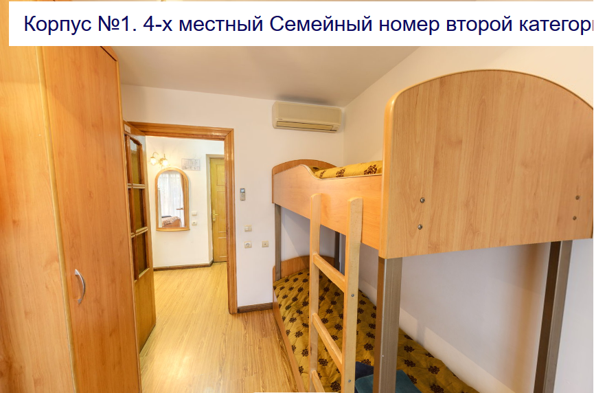 - 4-местный 2-комнатный Семейный. Площадь: 25 кв.м. В номере: спальня с двуспальной кроватью, холодильник, кондиционер, в гостинной находится двух ярусная кровать и односпальная кровать, кондиционер, французский балкончик ,вид на море, парковую зону север, юг.