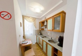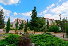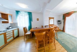 - 2-местный номер "Студио". В номере: гостиная с мягкой мебелью, кухня с электрооборудованием и посудой, барная стойка, спальня с двухместной широкой кроватью, совмещенный санузел, стиральная машинка ,сауна. Большой балкон с плетеной мебелью, с видом на парковую зону и горы, на юго-запад.